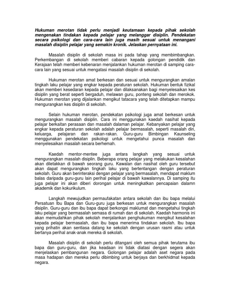 Hukuman Merotan Tidak Perlu Menjadi Keutamaan Kepada Pihak Sekolah Mengenakan Tindakan Kepada Pelajar Yang Melanggar Disiplin